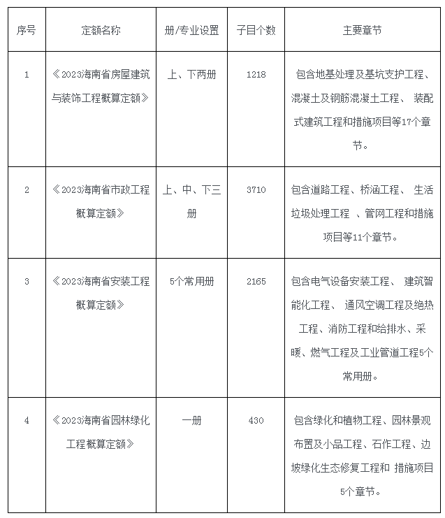 三、《2023海南省房屋建筑与装饰工程概算定额》、《2023海南省市政工程概算定额》、《2023海南省安装工程概算定额》和《2023海南省园林绿化工程概算定额》(以下简称“四个专业概算定额”)主要内容