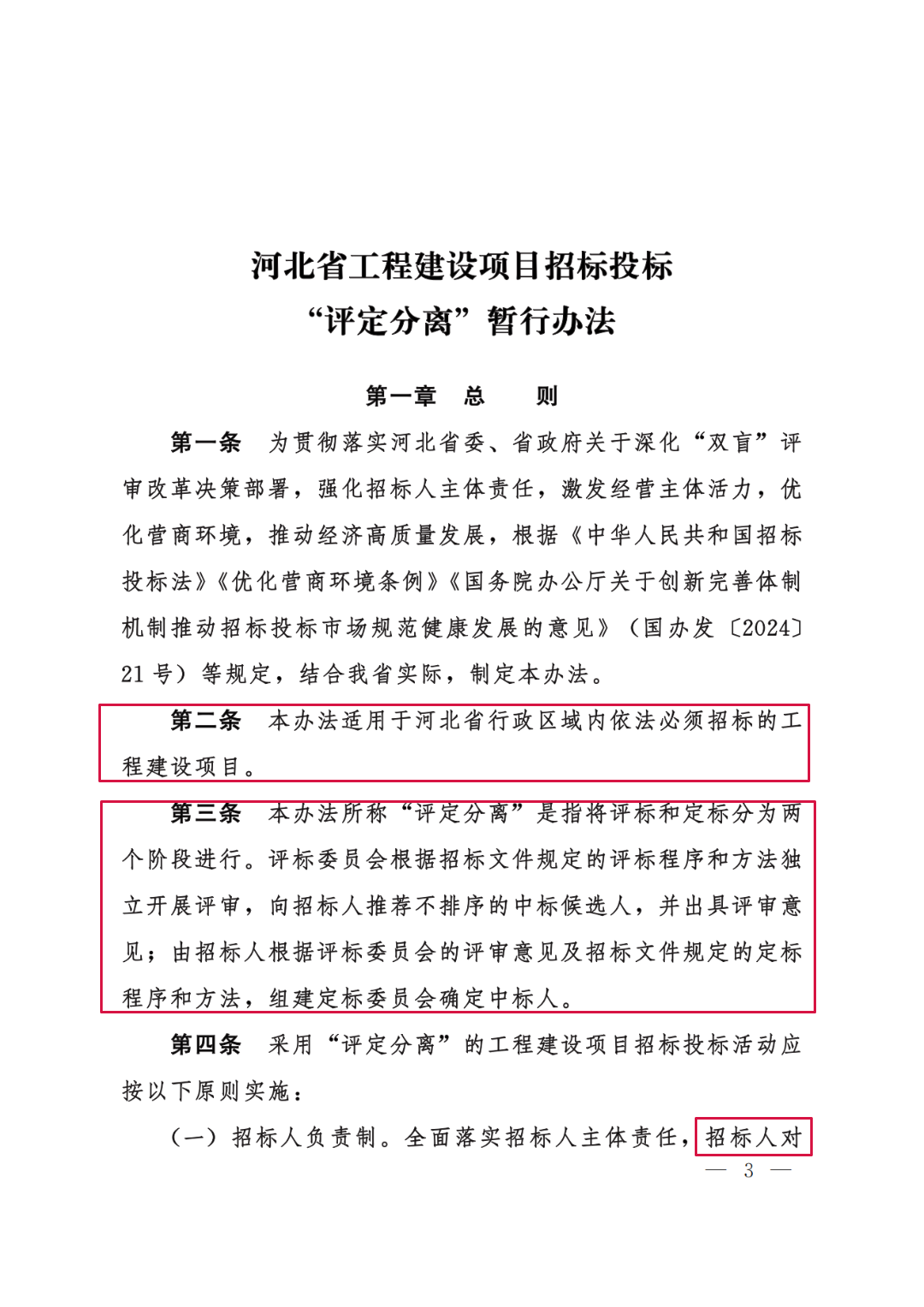 近日,河北省住建厅等5部门印发《河北省工程建设项目招标投标“评定分离”暂行办法》(冀数政规〔2024〕1号)。本办法自2024年8月1日起施行,有效期两年。