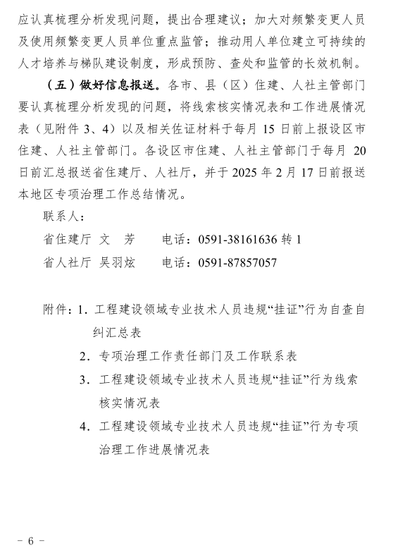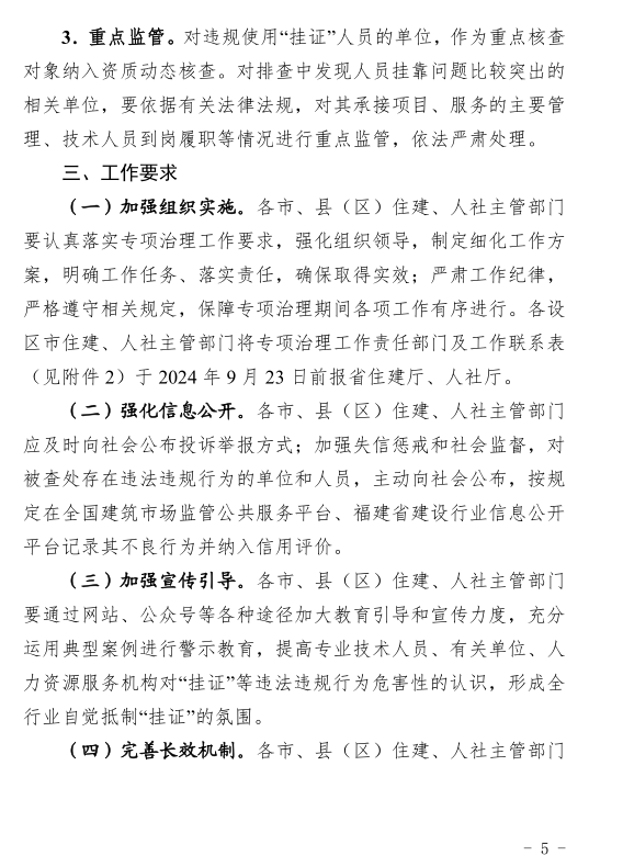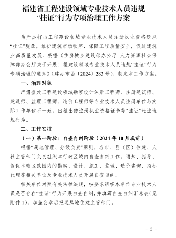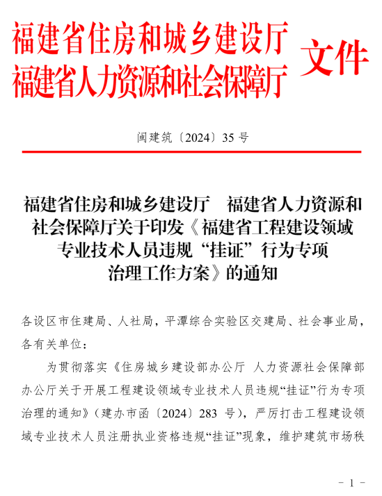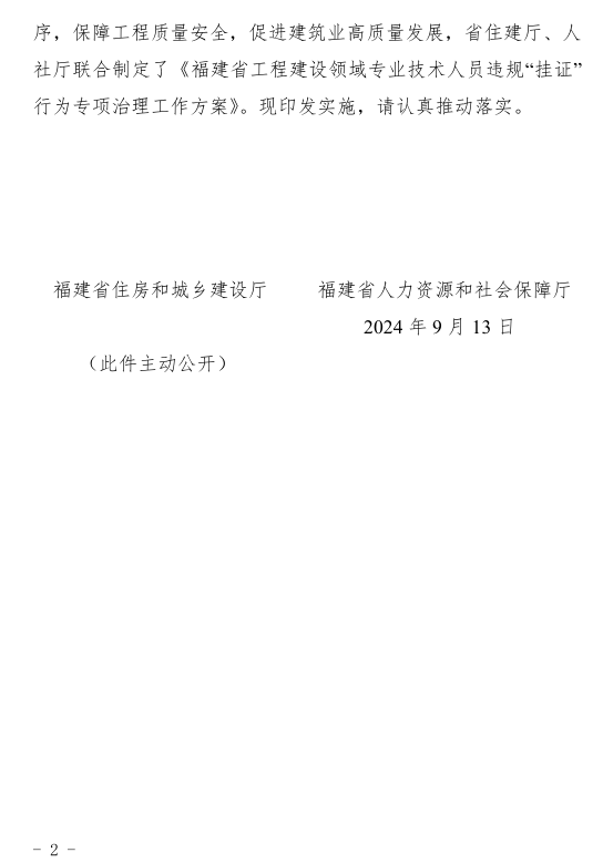 福建省住房和城乡建设厅 、省人力资源和社会保障厅联合发布关于印发《福建省工程建设领域专业技术人员违规“挂证”行为专项治理工作方案》的通知