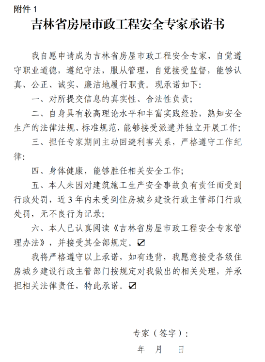 (四)签署承诺书。入库安全专家接受聘请时,应由本人签署《吉林省房屋市政工程安全专家承诺书》;