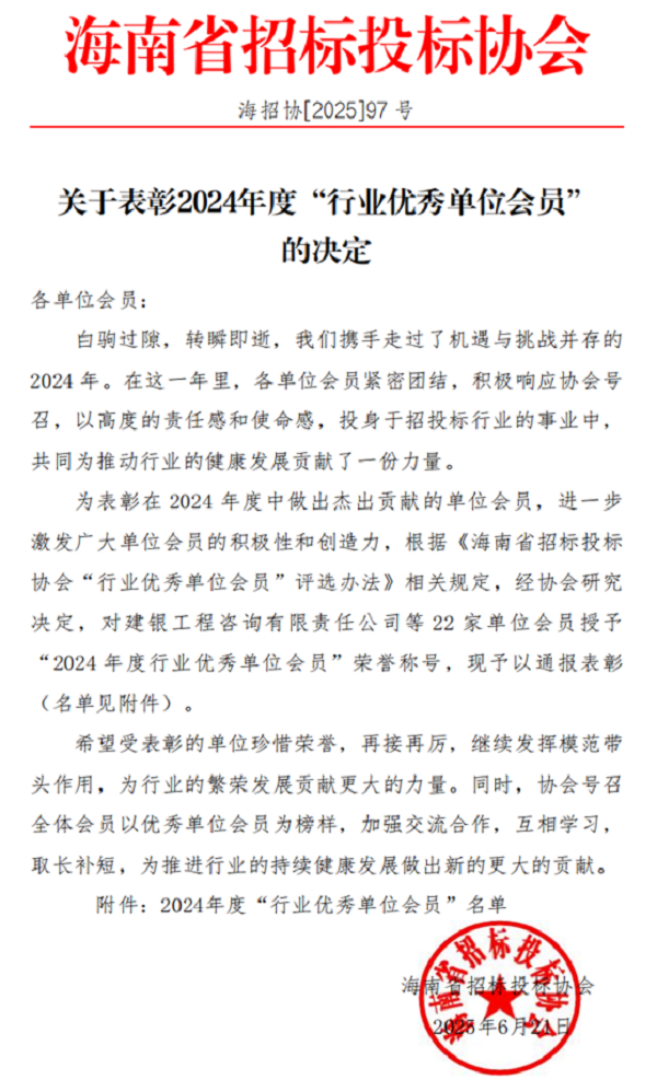 热烈祝贺开云手机登录入口荣获海南省招标投标协会2024年度行业优秀单位会员荣誉称号